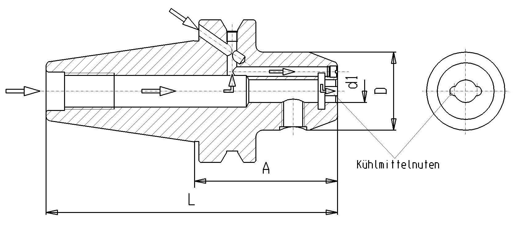Verwendung: | Für Fräser mit Zylinderschaft mit seitlicher Mitnahmefläche DIN 1835 Form B ohne Kühlkanäle. Auch bei diesen Schneidwerkzeugen ist, durch die Kühlmittelnuten, eine wirkungsvolle Kühlschmierung der Werkzeugschneiden gewährleistet .Die Maschine muß über Innere Kühlmittelzufuhr verfügen. |